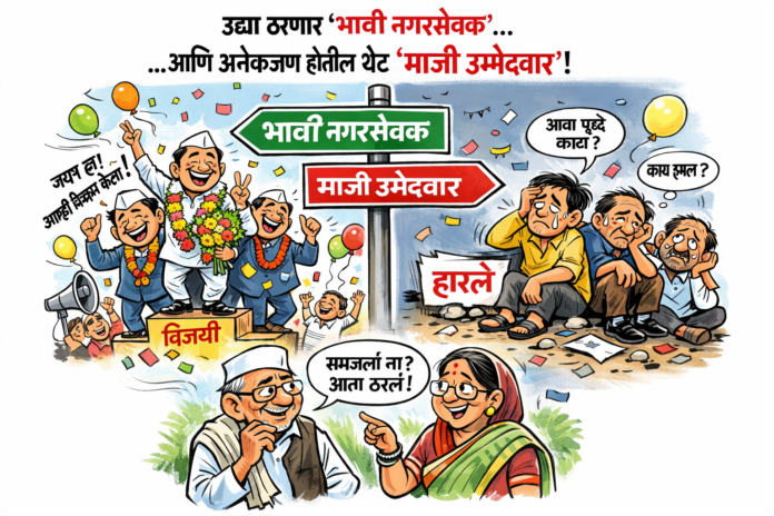 भद्रावती (प्रतिनिधी):-नगर परिषद निवडणुकीचा निकाल उद्या जाहीर होणार असून, शहरात प्रचंड उत्सुकतेसोबतच हलकीशी हास्याची लाटही पसरलेली आहे. कारण प्रचाराच्या काळात जेवढे उमेदवार होते, तेवढेच भावी नगरसेवक नसणार, हे आता जवळपास सर्वांनाच माहीत झाले आहे.