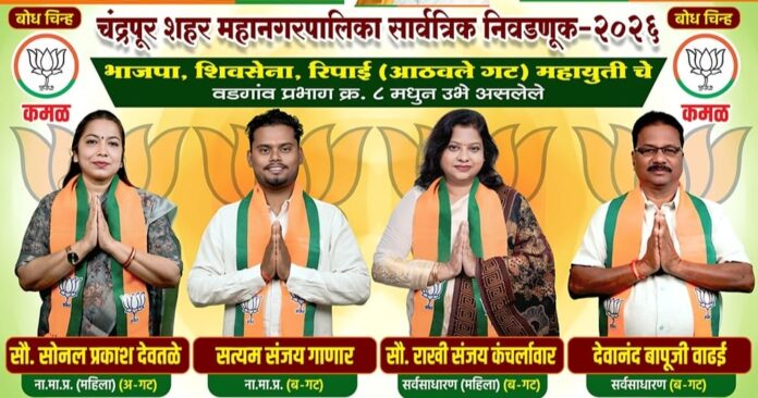 या पॅनलमध्ये महिला (सर्वसाधारण) प्रवर्गातून माजी महापौर सौ. राखी कंचलावार, महिला (ओबीसी) प्रवर्गातून सौ. सोनल प्रकाश देवतळे, पुरुष (सर्वसाधारण) प्रवर्गातून माजी नगरसेवक श्री. देवानंद वाढई, तर पुरुष (ओबीसी) प्रवर्गातून श्री. सत्यम गाणार यांचा समावेश आहे. अनुभव, कार्य आणि सामाजिक बांधिलकी यांचा मेळ या चारही उमेदवारांत दिसून येतो.