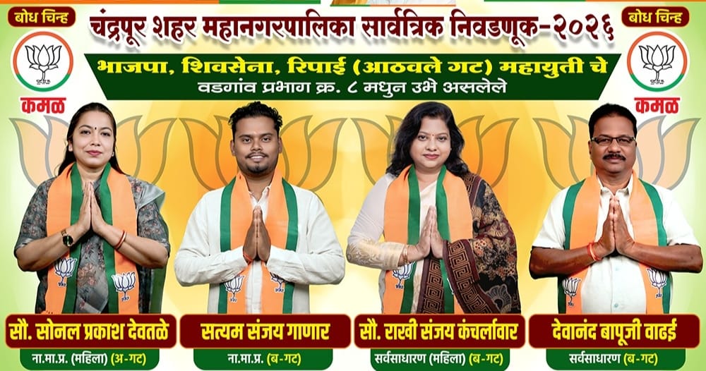 चंद्रपूर महानगरपालिका सार्वत्रिक निवडणूक २०२५..२६ च्या पार्श्वभूमीवर वडगाव प्रभाग क्रमांक ८ मध्ये विकासाची अपेक्षा आणि सेवेचा ठाम ध्यास घेऊन भारतीय जनता पार्टीचा अधिकृत उमेदवारांचा पॅनल जनतेसमोर उतरला आहे. कमळ या अधिकृत निवडणूक चिन्हावर लढणाऱ्या या पॅनलला प्रभागातील नागरिकांचा वाढता पाठिंबा मिळताना दिसत आहे.