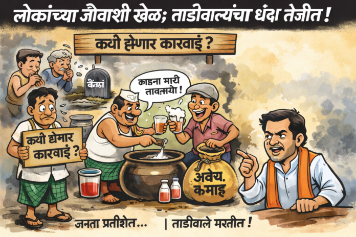 भद्रावती तालुक्यातील मानोरा फाटा व तांडा परिसरात रसायन मिसळून तयार केलेल्या बनावट ताडीची खुलेआम विक्री सुरू असल्याचा गंभीर प्रकार समोर आला आहे. ही ताडी आरोग्यास अत्यंत घातक असून, ती पिल्यामुळे लोकांचे जीव धोक्यात येण्याची भीती व्यक्त केली जात आहे.या अवैध धंद्यातून काही लोक दररोज मोठ्या प्रमाणात पैसा कमावत असल्याची माहिती आहे. याबाबत यापूर्वीही तक्रारी व सूचना देण्यात आल्या होत्या. मात्र, तरीसुद्धा हा ताडीचा धंदा आजही जोरात सुरू असल्याचे चित्र दिसून येत आहे.